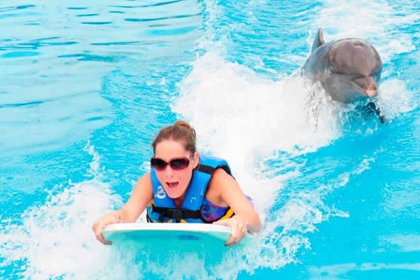 Los delfines realizarán contigo divertidas actividades, los podrás saludar y dar un beso, te llevarán a dar un paseo a toda velocidad a través del agua durante el Dorsal Tow y después, los delfines te impulsarán de la planta de tus pies para empujarte sobre la superficie del agua en el famoso Foot Push.